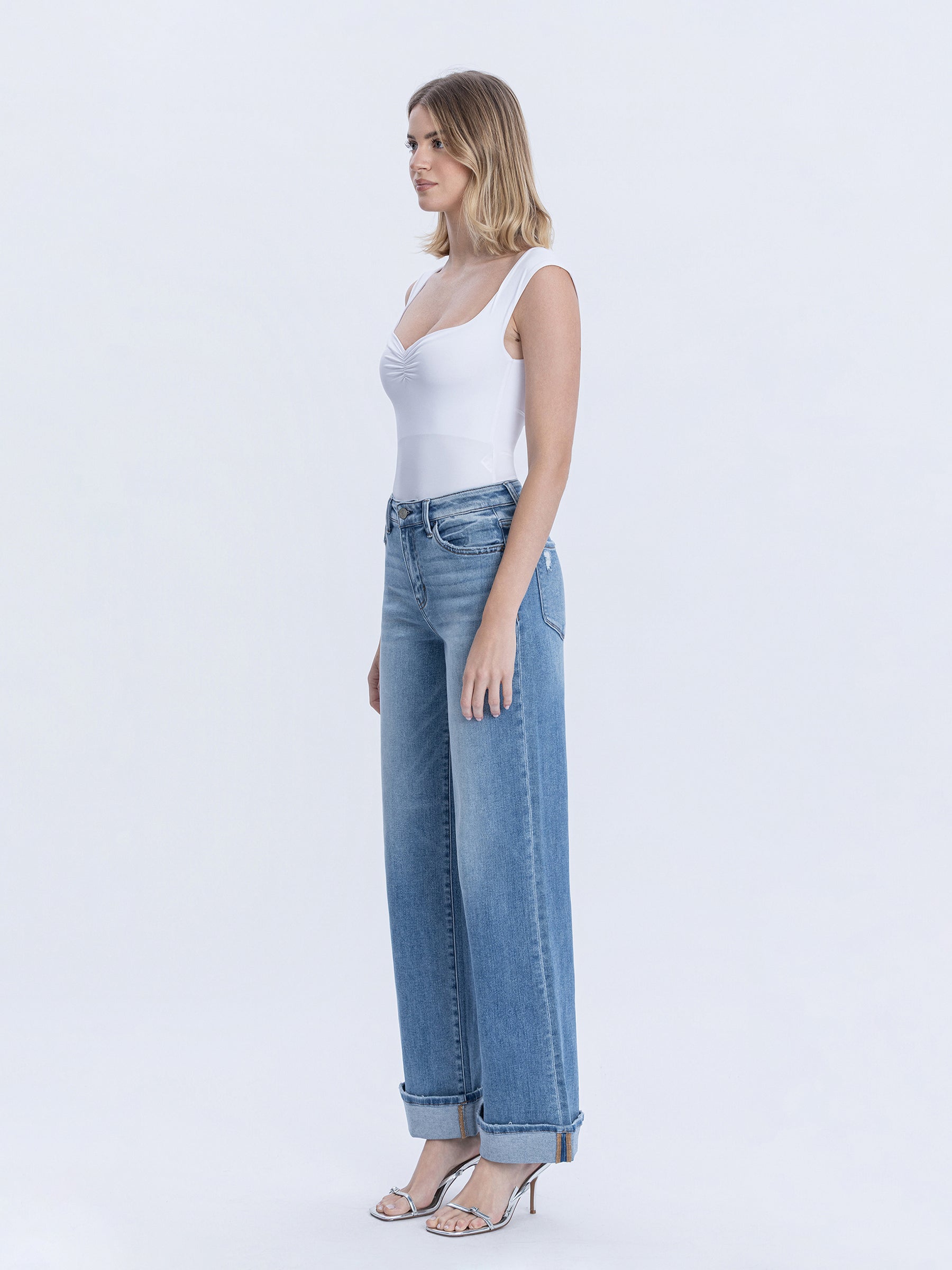 High Rise Full Length Cuffed Wide Jeans