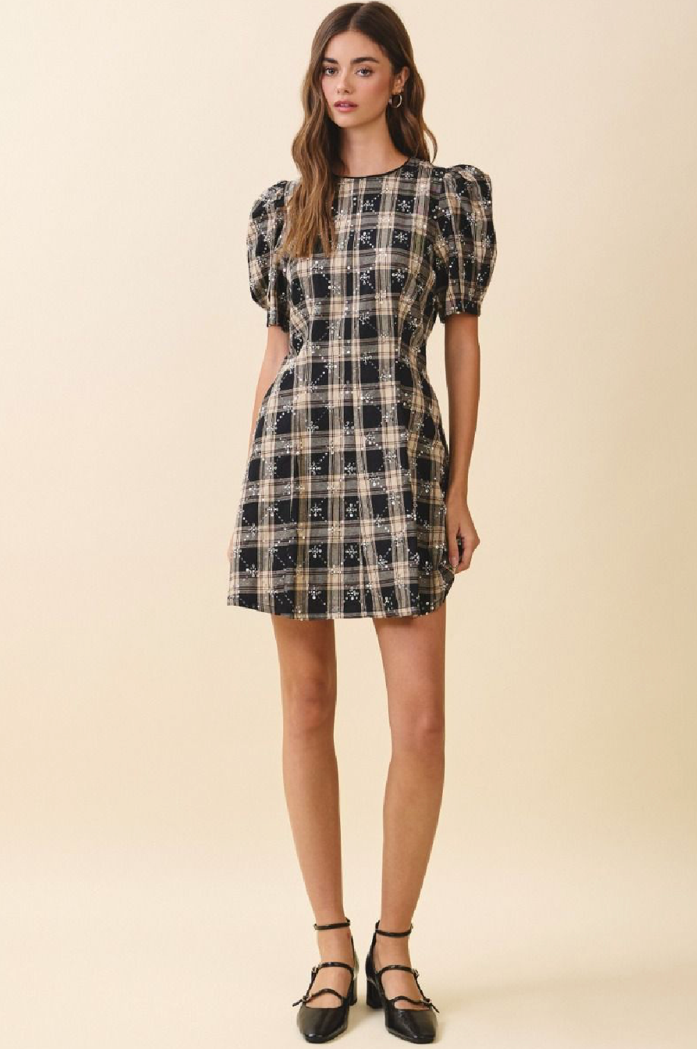 A short-sleeve mini dress featuring a plaid pattern adorned with delicate sequin embellishments throughout. Designed with puff sleeves, a fitted bodice, and an A-line skirt for a flattering silhouette. Finished with a concealed back zipper and side pockets for added functionality. Model Size + Fit: Model height: 5'8" Dress size: Small Bust: 31 Waist: 25 Hips: 35