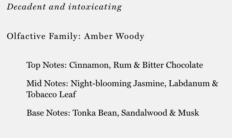 Calle Ocho is a celebration of the unique combination of cultures that comprise Little Havana. The fragrance opens with the multifaceted notes of fine aged Rum: the swirling combination of woody Amber, Oak Wood, and Bourbon-like Vanilla. The scent opens to reveal creamy Sandalwood, a hint of Orange Rind, and rich aromatic Tobacco Leaf spiced with Cinnamon. The resulting experience from Calle Ocho is warm, welcoming, and one-of-a-kind.