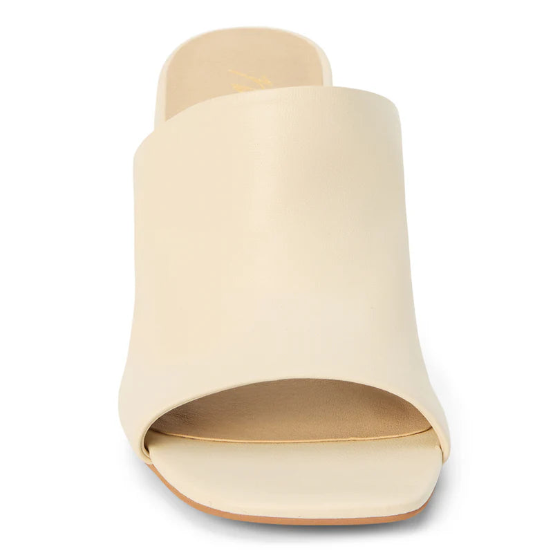 Block-heeled slide sandal with unstructured upper.