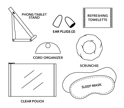 Rediscover the joy of travel with the new 7-piece Travel Set by Pinch Provisions. The clear zipper pouch contains a convenient assortment of practical luxuries: sherpa sleep mask (with silky backing), ear plugs, refreshing towelette, vegan leather cord organizer, and a phone/tablet stand. With room for additional items like a passport, ticket, or face covering, this Travel Set is a must-get for the modern jet-setter.