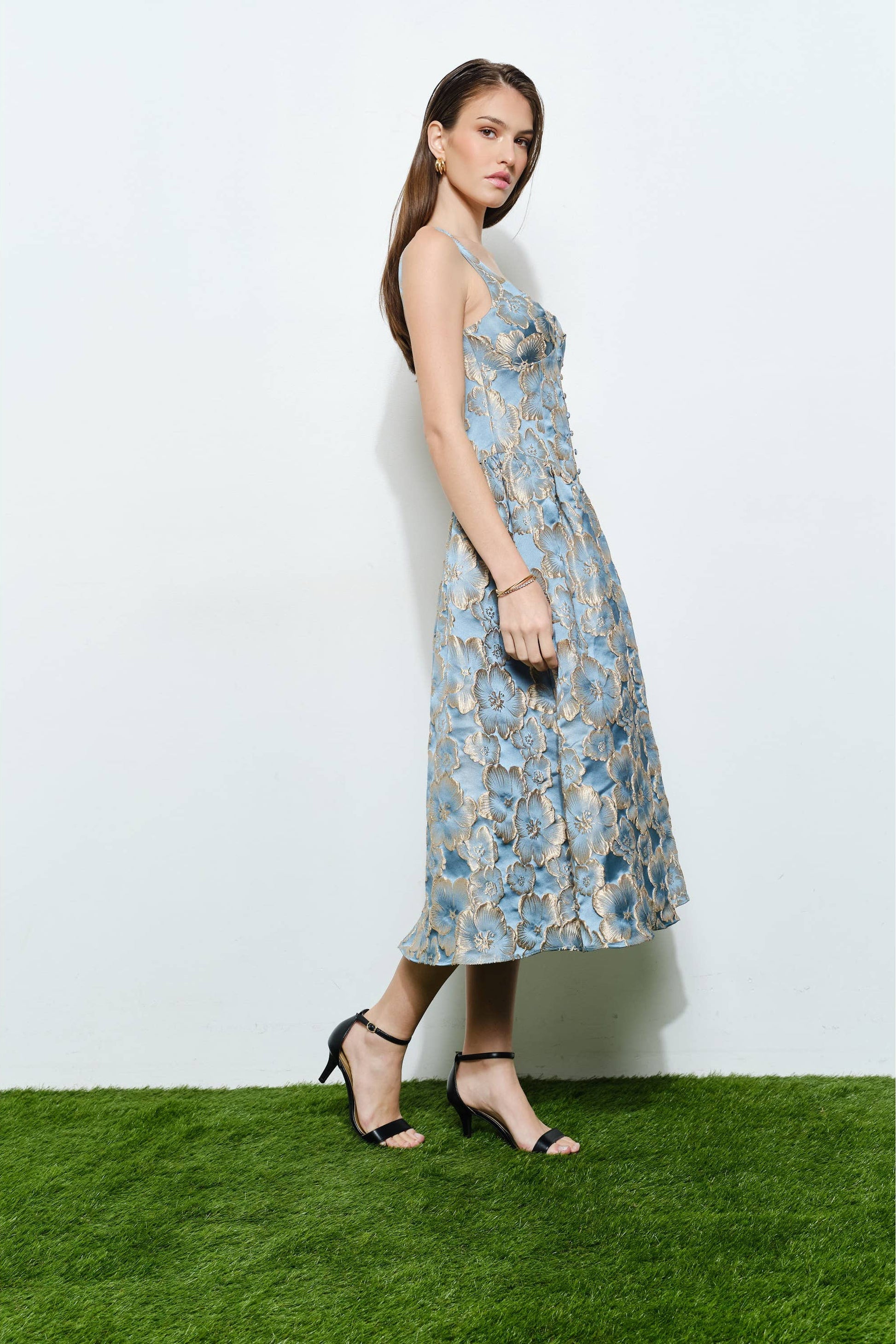 Romantic Gold Jacquard Texture Floral Sweetheart Thick Straps Sleeveless Self Button Down Midi Dress