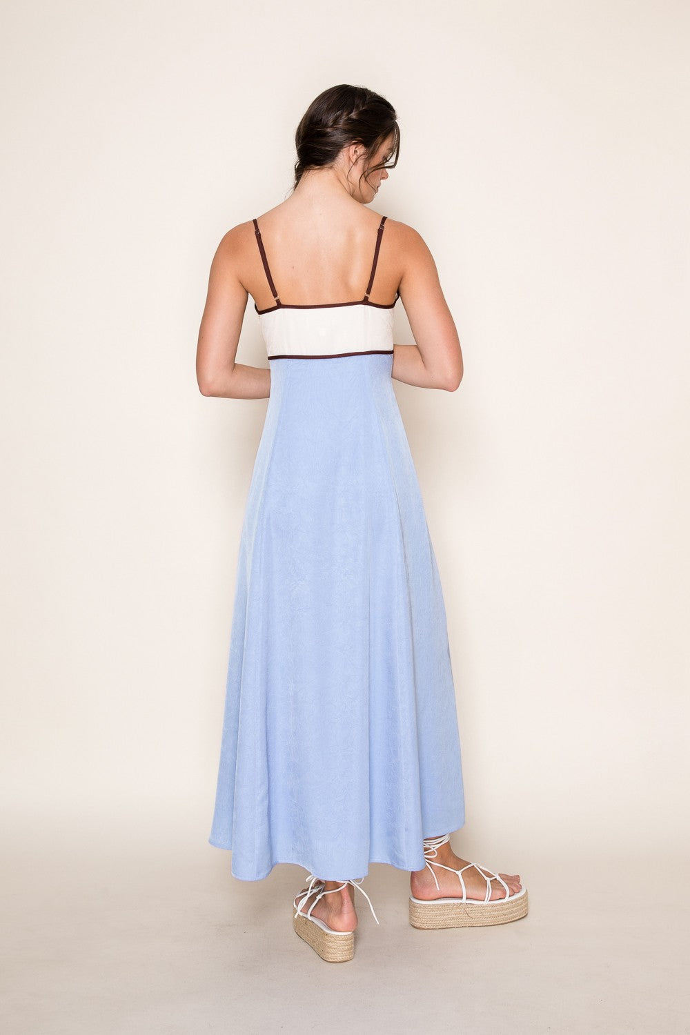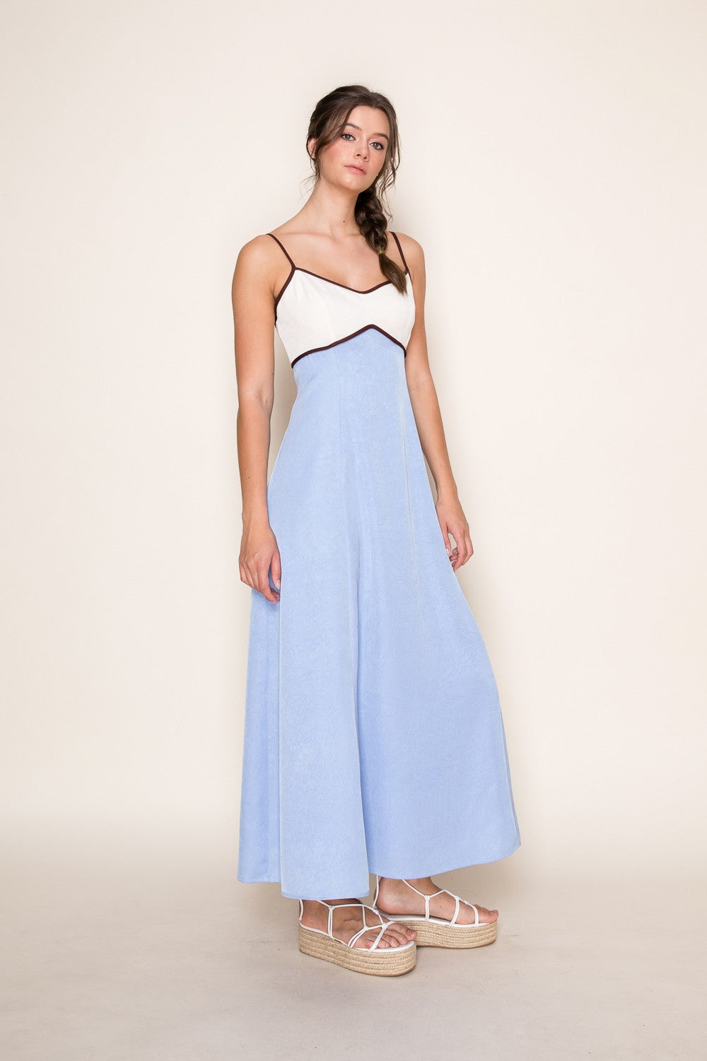 Meet the dress that feels like summer by the shore. The Sky & Sea Maxi blends soft coastal hues in a dreamy two-tone colorblock design that’s effortlessly feminine and modern. Featuring a flattering fitted bodice with delicate contrast trim and adjustable spaghetti straps, this silhouette flows into a breezy, full-length skirt that moves beautifully with every step.